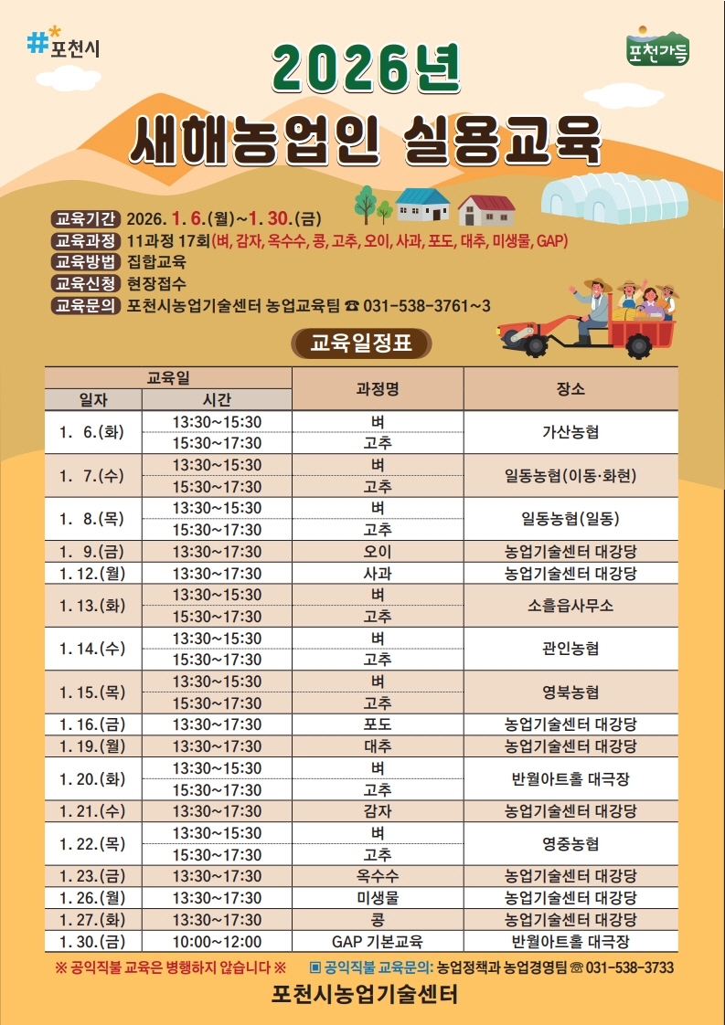 포천시는 오는 1월 6일부터 30일까지 지역 농업인의 영농기술 향상과 농업 경쟁력 강화를 위해 ‘2026년 새해농업인 실용교육’을 추진한다.