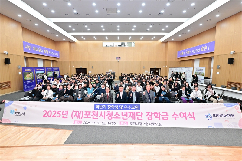 (재)포천시청소년재단(이사장 백영현)은 지난 21일(금) 포천시청 대회의실에서 2025년 하반기 장학금 수여식을 개최해 장학생과 학부모 등 200여 명이 참석해 축하와 격려를 나누는 뜻깊은 시간을 가졌다.